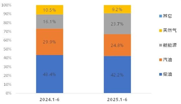 从燃料类型看,2025年上半年相较于2024年同期,柴油和汽油商用车市场份额小幅下滑,新能源商用车占比显著提升;与此同时,受油价下调影响,油气价差持续收窄,天然气经济性优势减弱,叠加运价低迷、补贴政策延迟以及新能源重卡的竞争,天然气商用车市场份额亦出现回落。