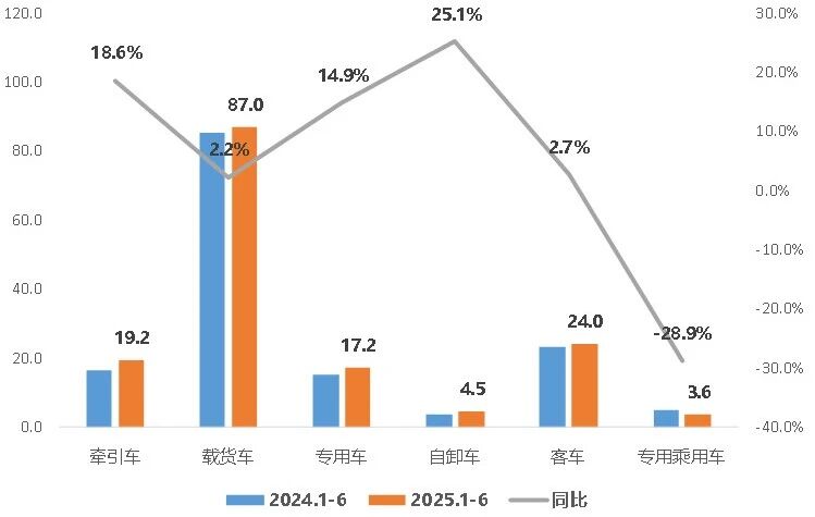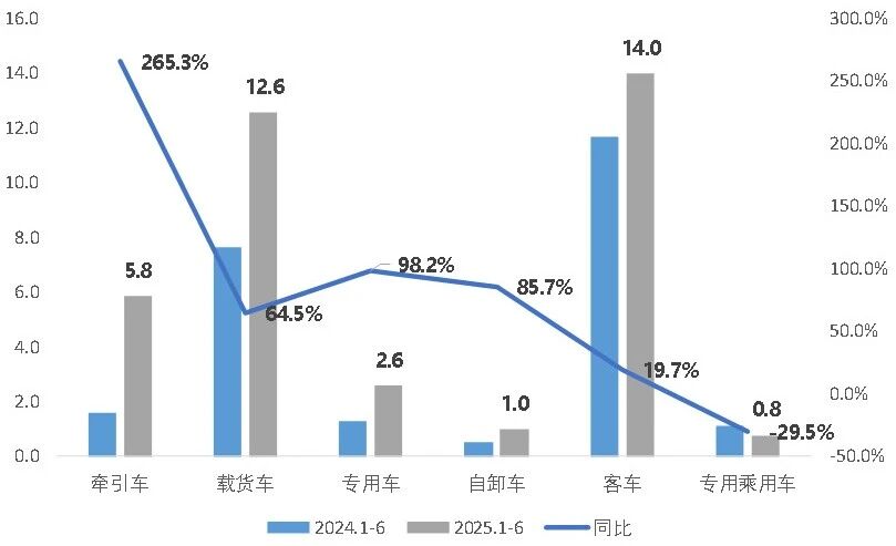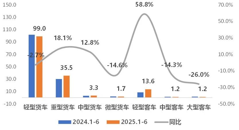 2024年与2025年上半年商用车细分车型销量情况(万辆)
