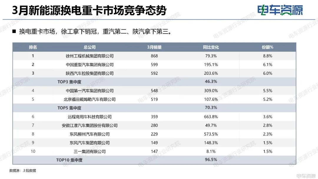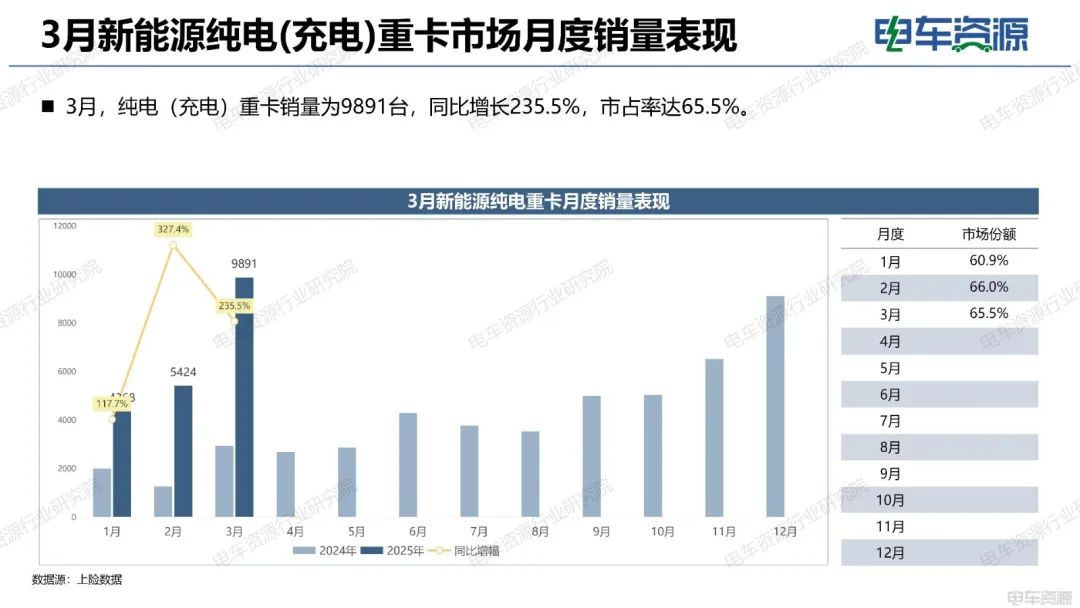 充电重卡和换电重卡市场表现:2025年3月销量显著增长,纯电充电从2024年的2948辆增至9891辆,同比增幅235.5% ;纯电换电从2144辆增至4444辆,增幅107.3%。说明纯电驱动的重卡市场接受度大幅提升。 燃料电池和插电式混动:燃料电池2025年3月销售708辆,同比增长195.0%,但基数仍较小;插电式混动从24辆增至50辆,同比增幅达108.3%,虽增幅较高,但整体规模有限 。