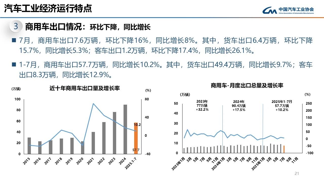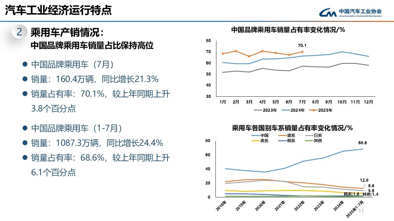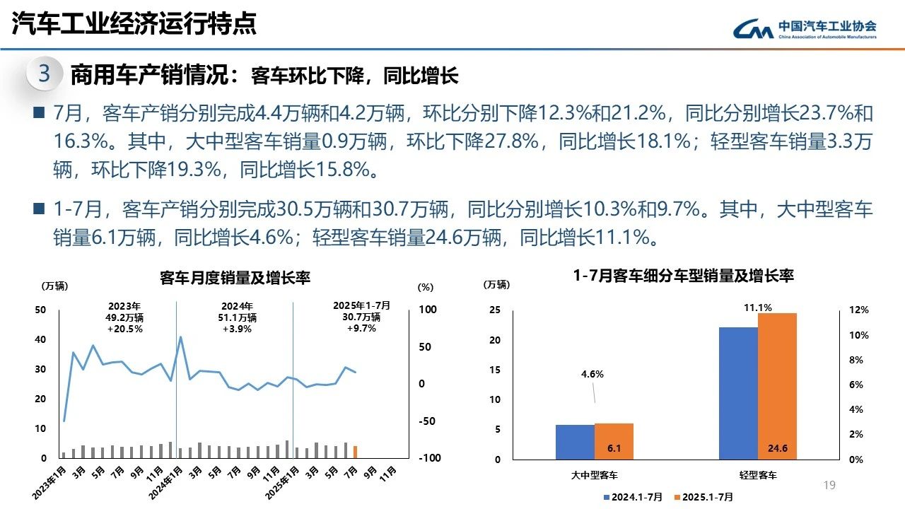 据中国汽车工业协会分析,7月,车市进入传统淡季,部分厂家安排年度设备检修,产销节奏有所放缓,环比呈现季节性回落。从行业市场环境看,以旧换新政策效果继续显现,行业综合整治“内卷”工作取得积极进展,企业新车型持续投放,助力车市平稳运行,同比实现增长。其中,新能源汽车延续快速增长态势,汽车出口保持平稳。