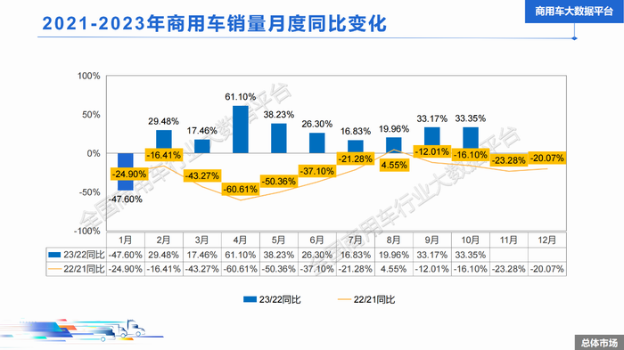 2023年1-10月全国商用车累计整体销量(批发)为330.29万辆,累计同比上涨19.89%。