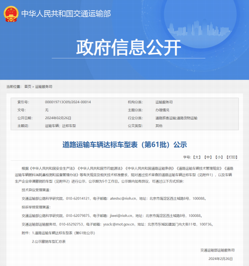 近日,交通运输部运输服务司发布了通过技术审查的《道路运输车辆达标车型表(第61批)公示》(以下简称《达标车型》)。